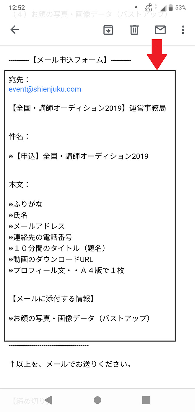 a.ブラウザで「全国・講師オーディション」と検索して、矢印の「エントリーの仕方」をタップします。